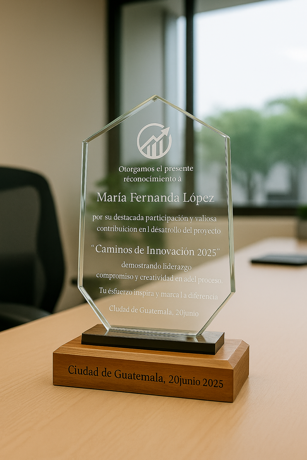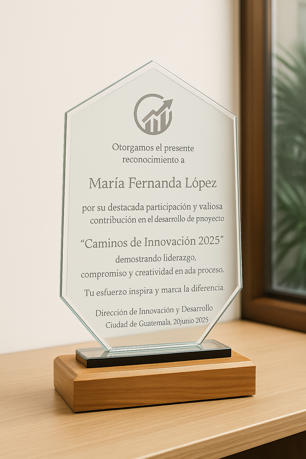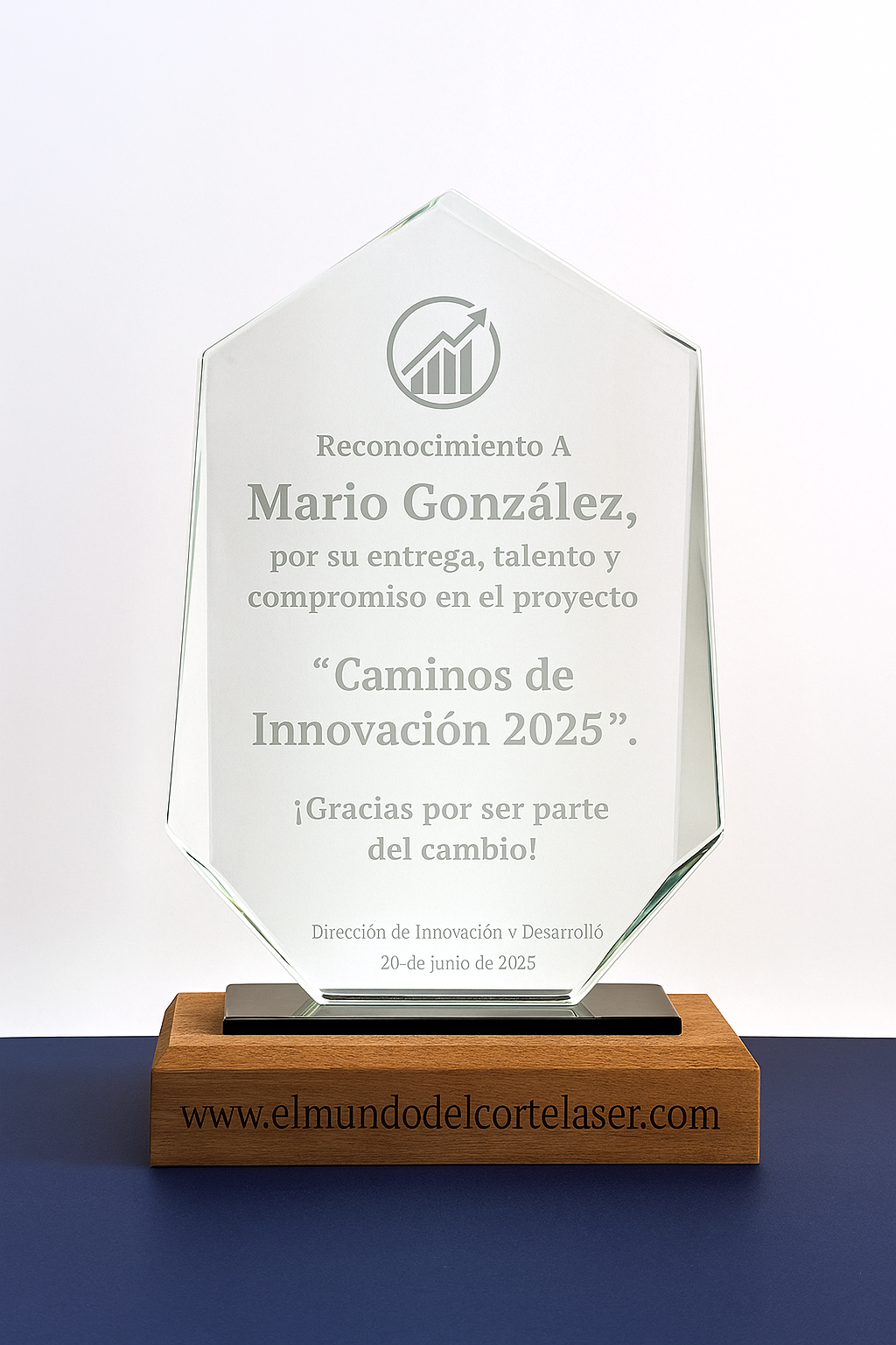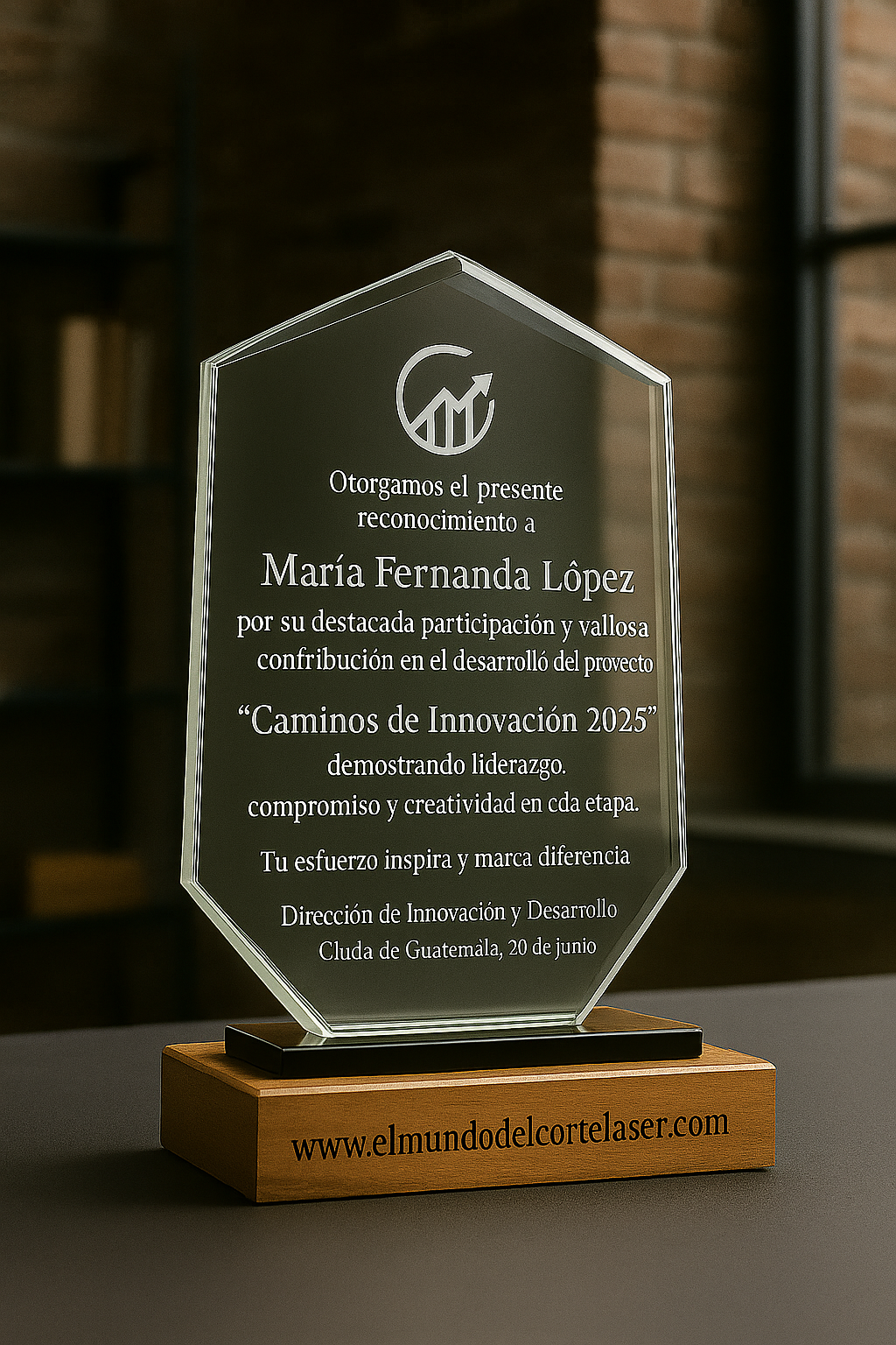 Fabricado en vidrio claro con bordes biselados y grabado láser CO₂ de alta precisión, montado sobre una base de madera robusta que también puede personalizarse.